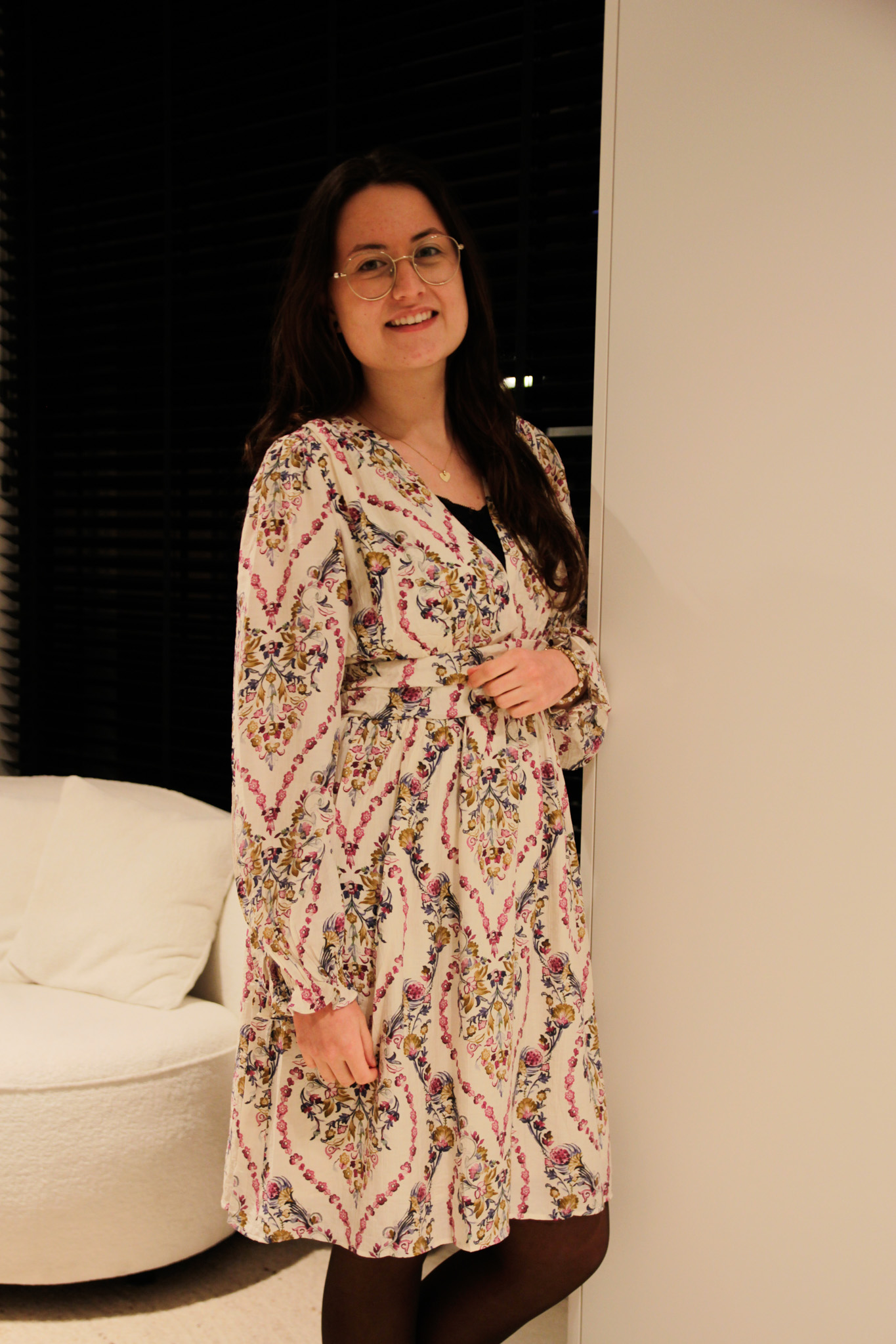 Jurk Luna is een fijne jurk met een vrolijke voorjaarsbloemenprint. De soepele stof draagt comfortabel en voelt licht aan, ideaal voor het voorjaar en de zomer. De jurk heeft een mooie lengte van 94 cm in maat M/L en valt prettig om het lichaam.