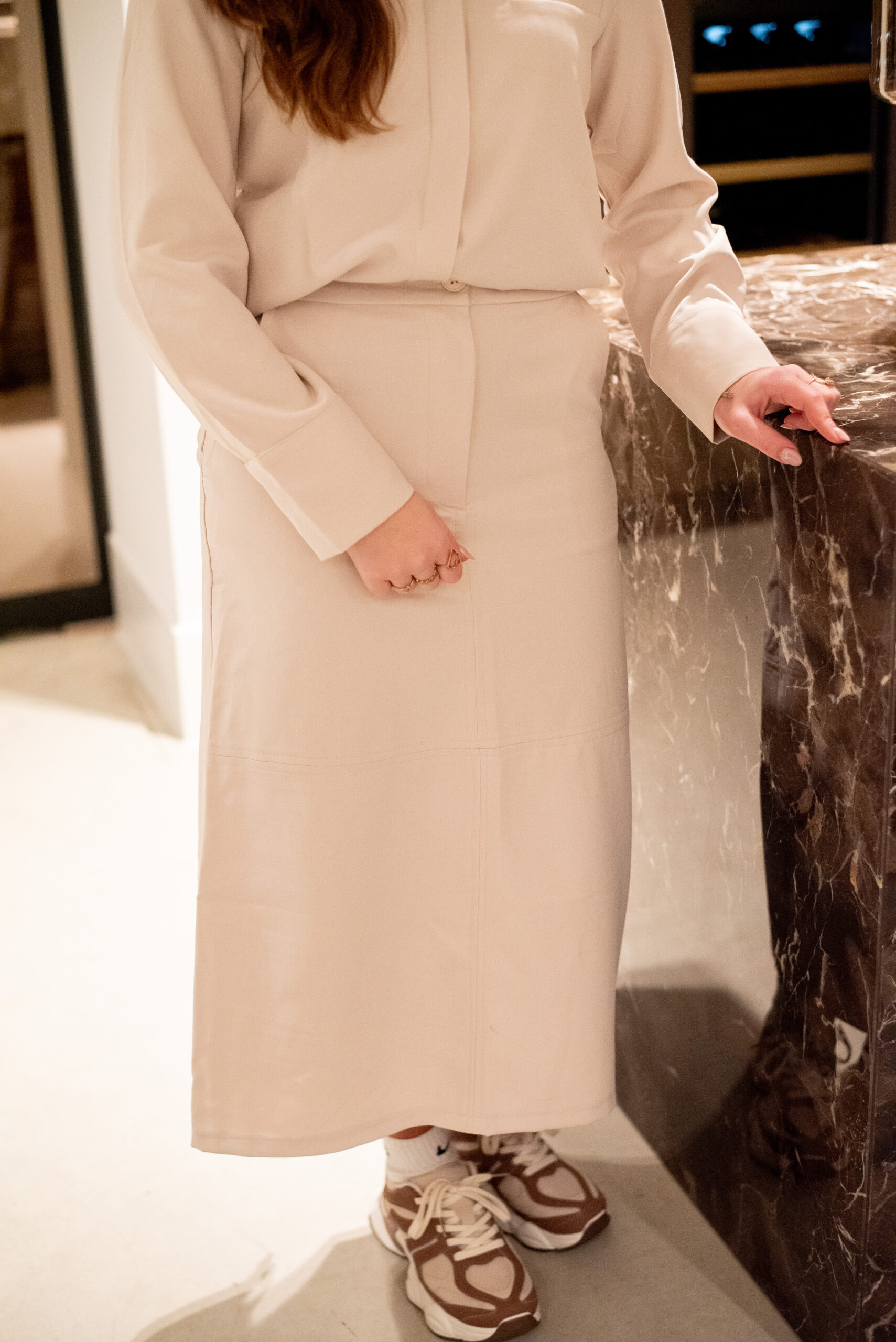Een stijlvolle midi rok met een subtiele split aan de achterkant en een elastische band voor extra comfort. Dit tijdloze model is elegant en veelzijdig, en combineert prachtig met de bijpassende blouse voor een complete, chique look.