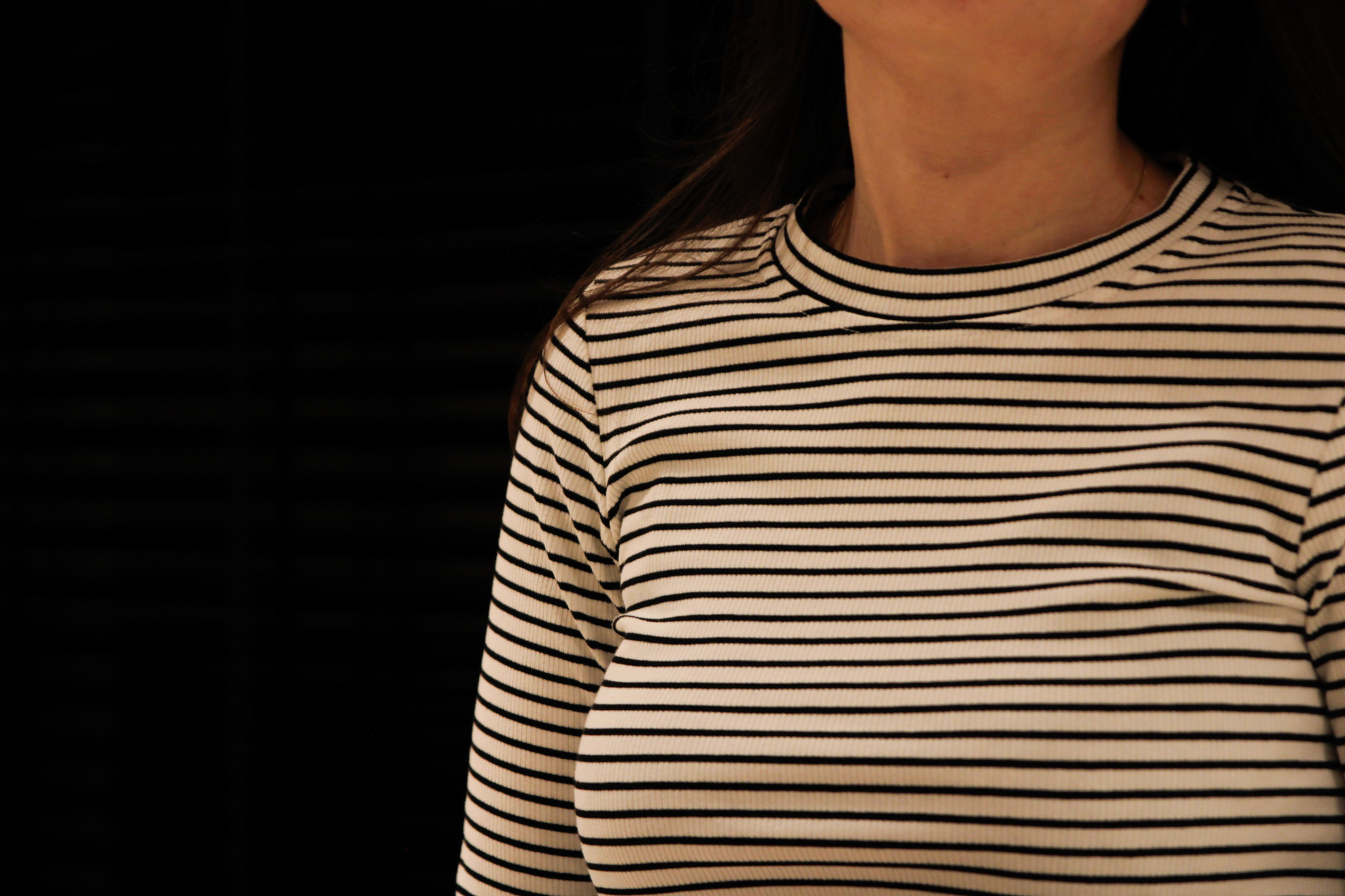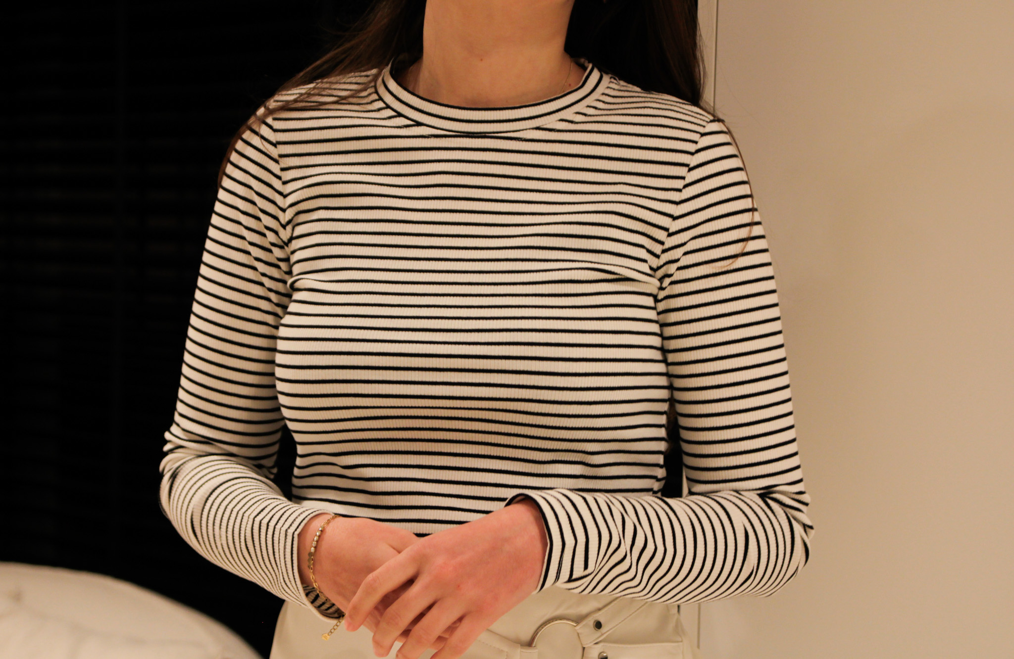 Dit onesize shirt van Azzurro heeft een wit design met dunne zwarte ovale streepjes en lange mouwen, perfect voor een moderne en comfortabele look.