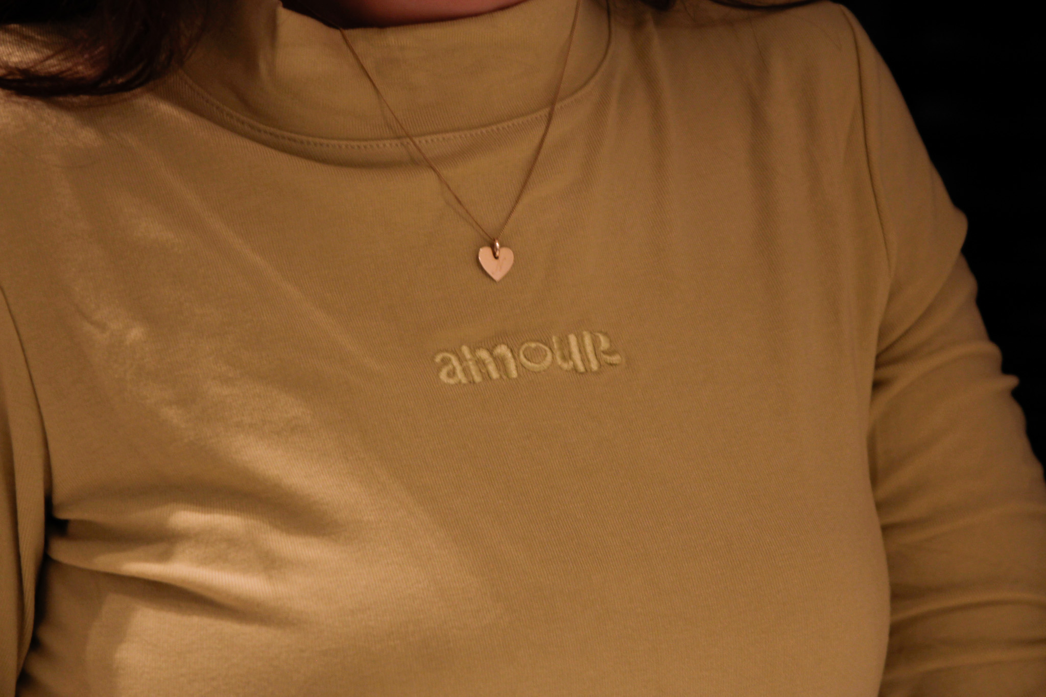 Dit shirt met lange mouwen heeft de tekst “Amour” op de voorkant en is perfect voor een relaxte, stijlvolle look.