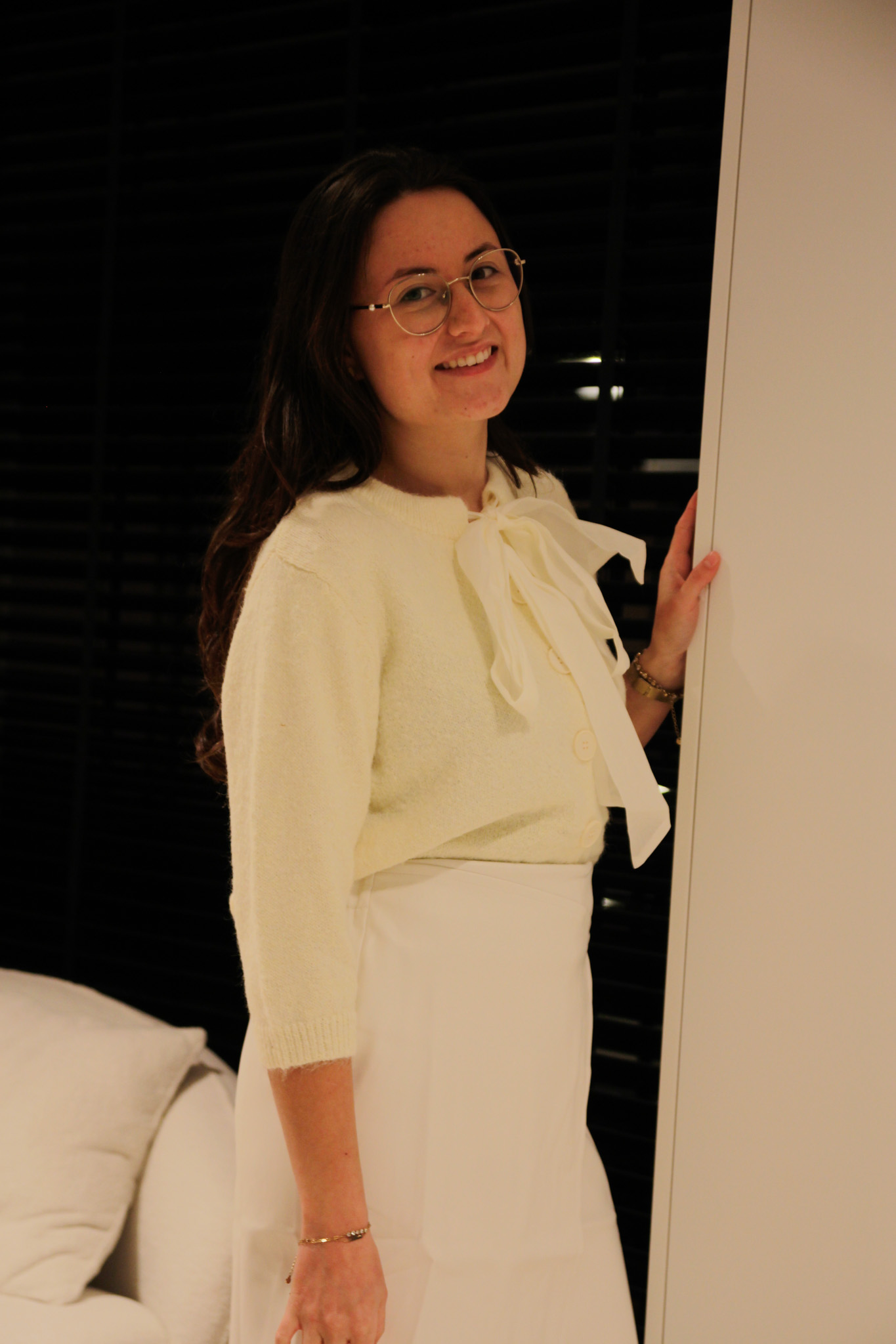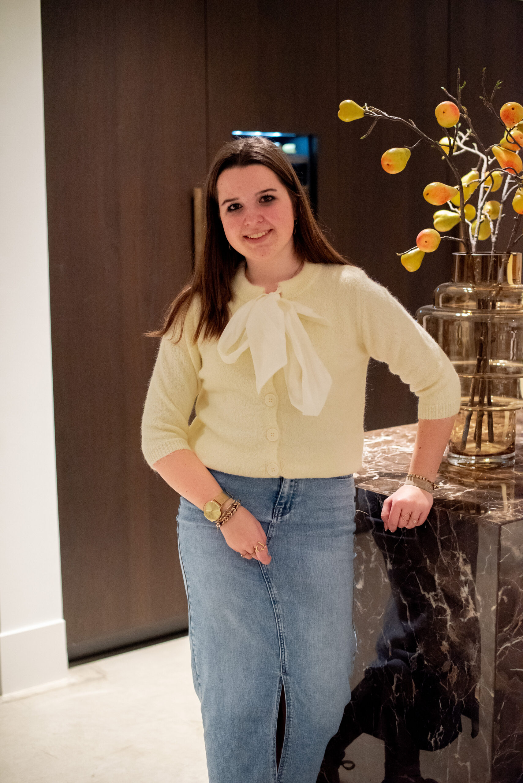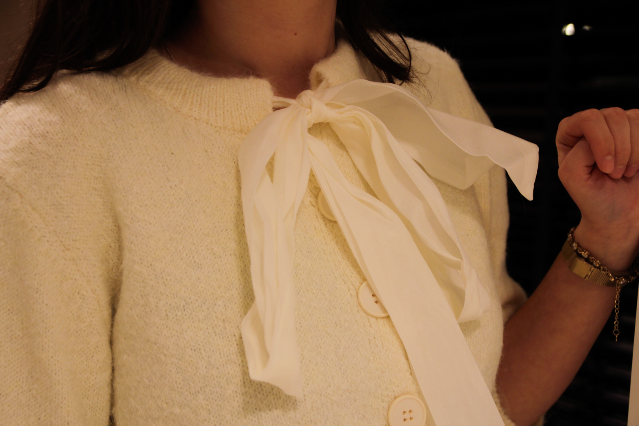 - Details: Knopen en strik bij de hals