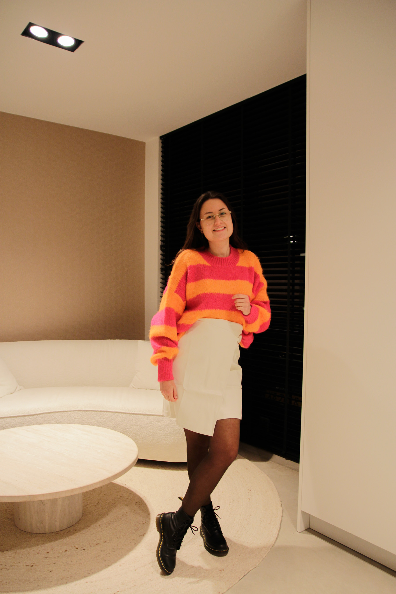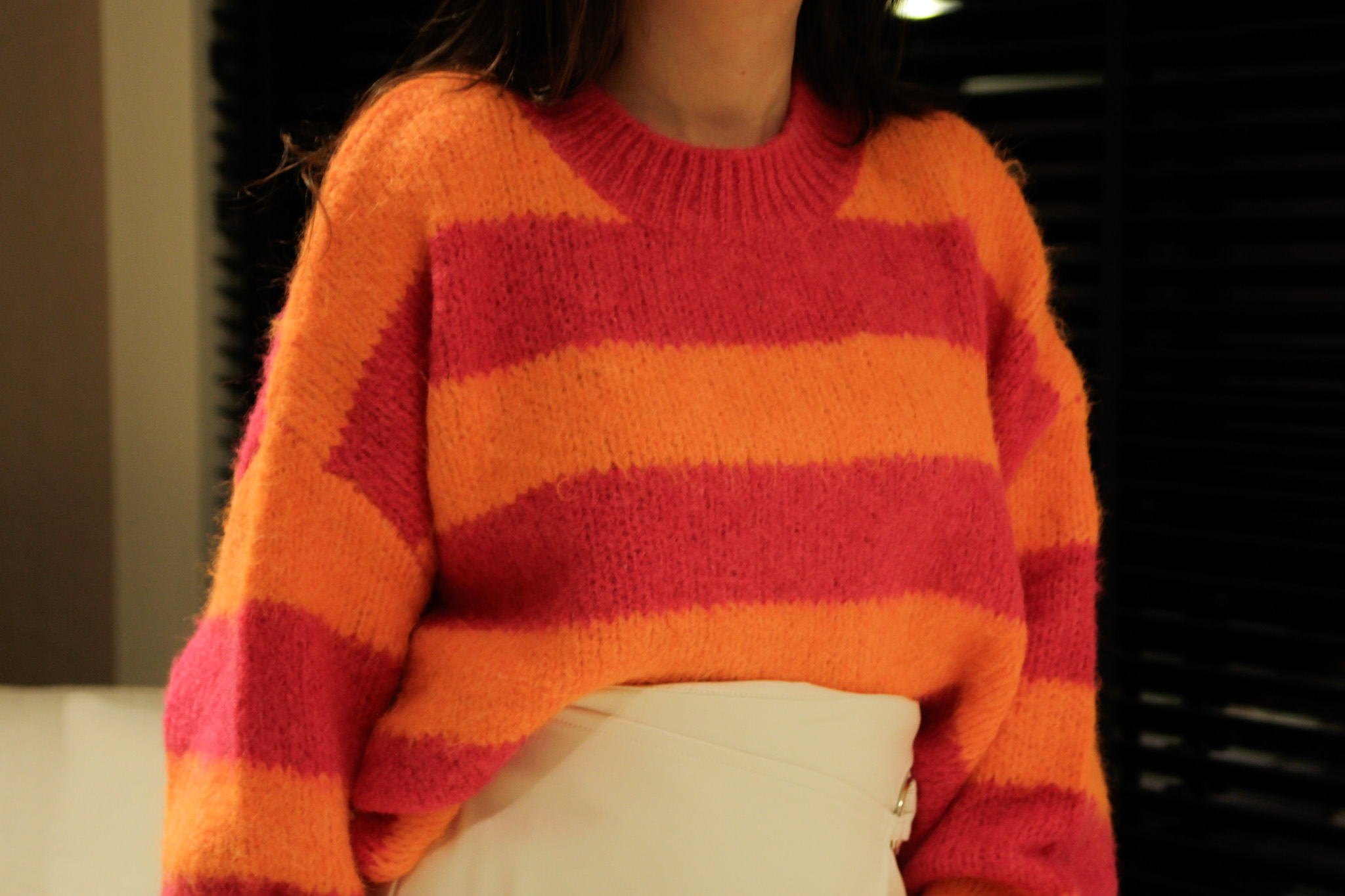 Deze onesize trui van Azzurro heeft een brede ovale streep in de kleuren oranje en magenta, wat zorgt voor een speelse en moderne uitstraling.