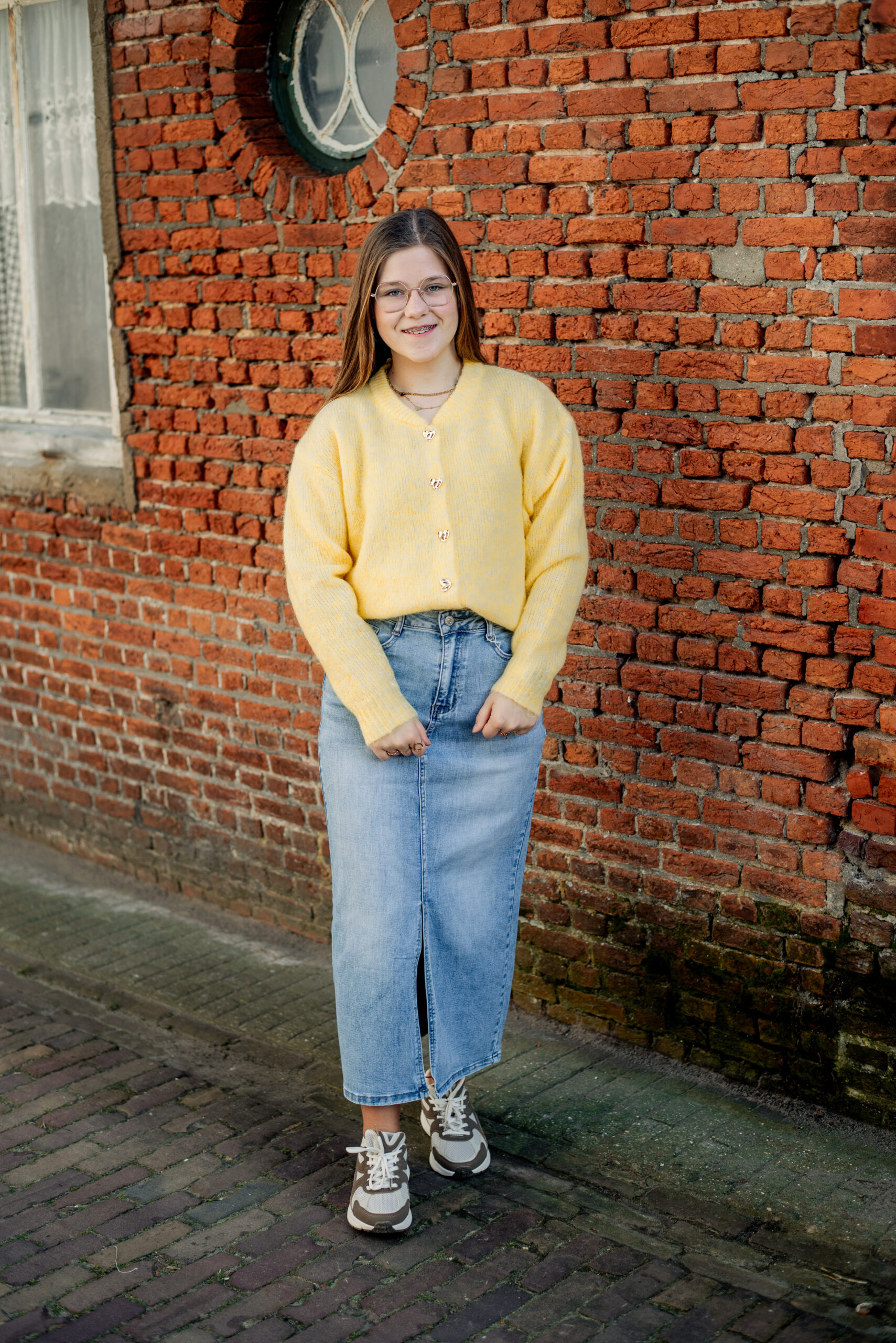 Dit vrolijke gele vest is een echte eyecatcher. De prachtige gouden knopen in hartjesvorm geven het vest een speelse en vrouwelijke uitstraling. Dankzij de onesize pasvorm zit het vest comfortabel en is het makkelijk te combineren met verschillende outfits. Perfect voor een frisse, stijlvolle look.